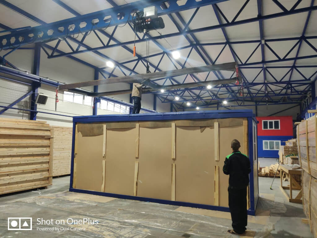 У нас большой крытый производственный цех, площадь которого позволяет собирать несколько конструкций одновременно и независимо от погодных условий, работа не останавливается не на минуту. В штате компании всегда работают высококвалифицированные специалисты, разделенные на бригады, благодаря этому нам удалось наладить процесс сборки так что простоев в работе нет и процесс изготовления большого блок-контейнера занимает всего пару дней.